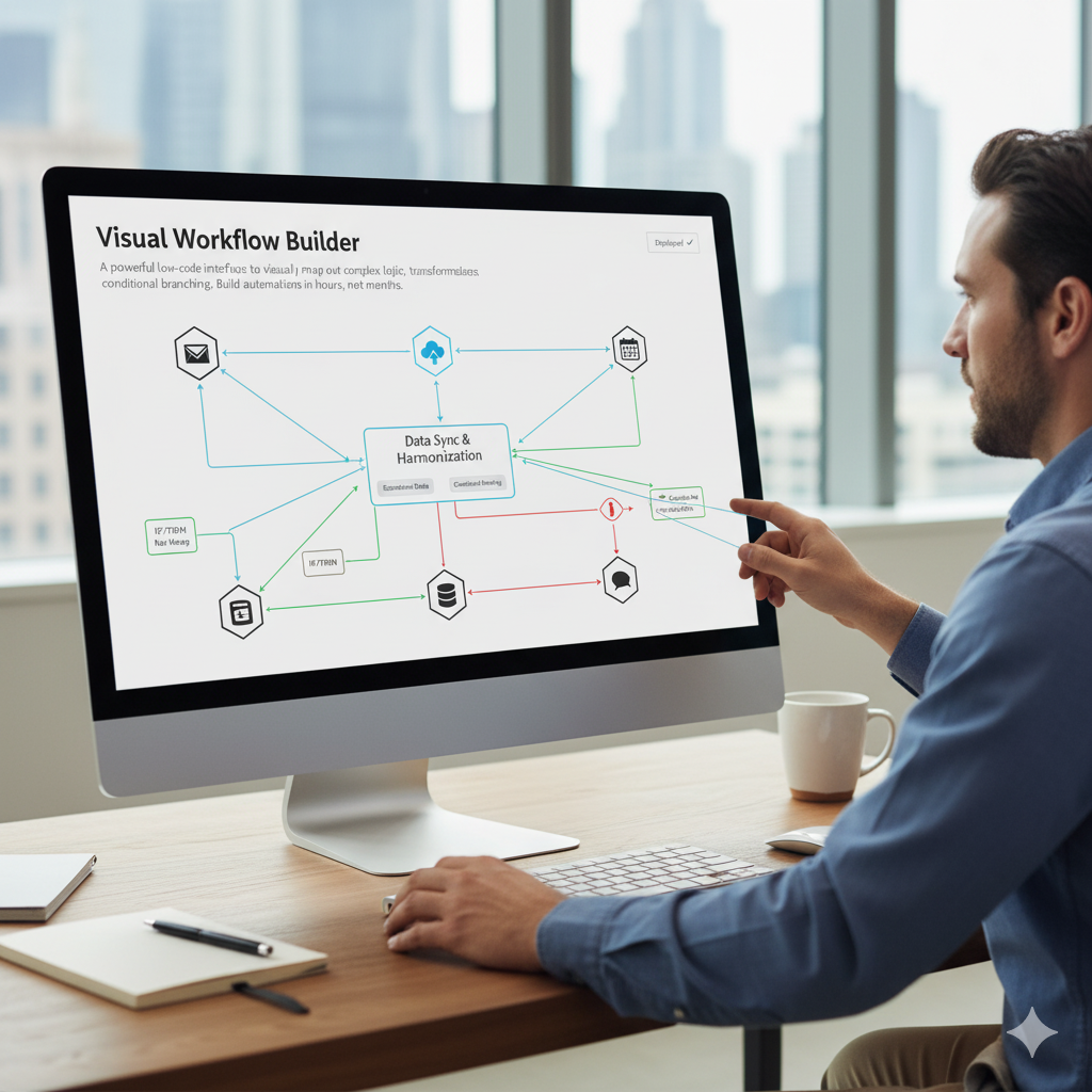 A powerful low-code interface to visually map out complex logic, transformations, and conditional branching. Build automations in hours, not months.